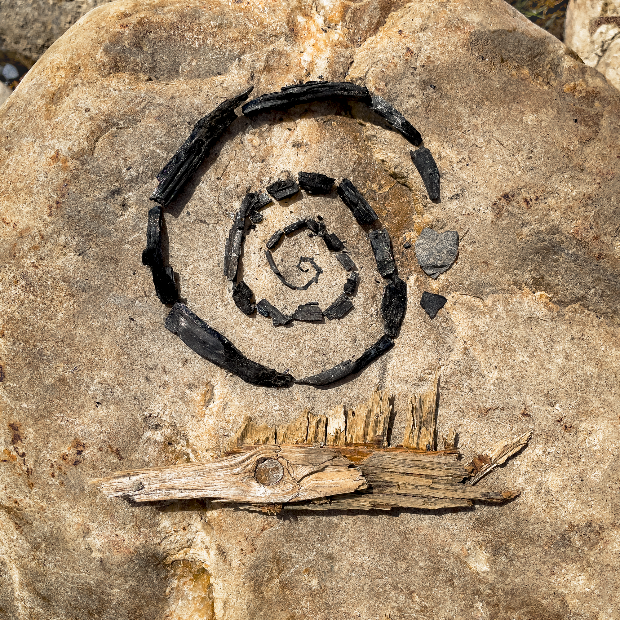 This one was built with simple raw materials: charred tinder from a fire built on the shore of a lake Lily and I visit often, a couple of pieces of wood strewn nearby (perhaps remnants of kindling?), a sun-baked sandstone boulder—along with what I find to be the most helpful tool in crafting with mystery: a willing and open collaboration with the imaginal field.